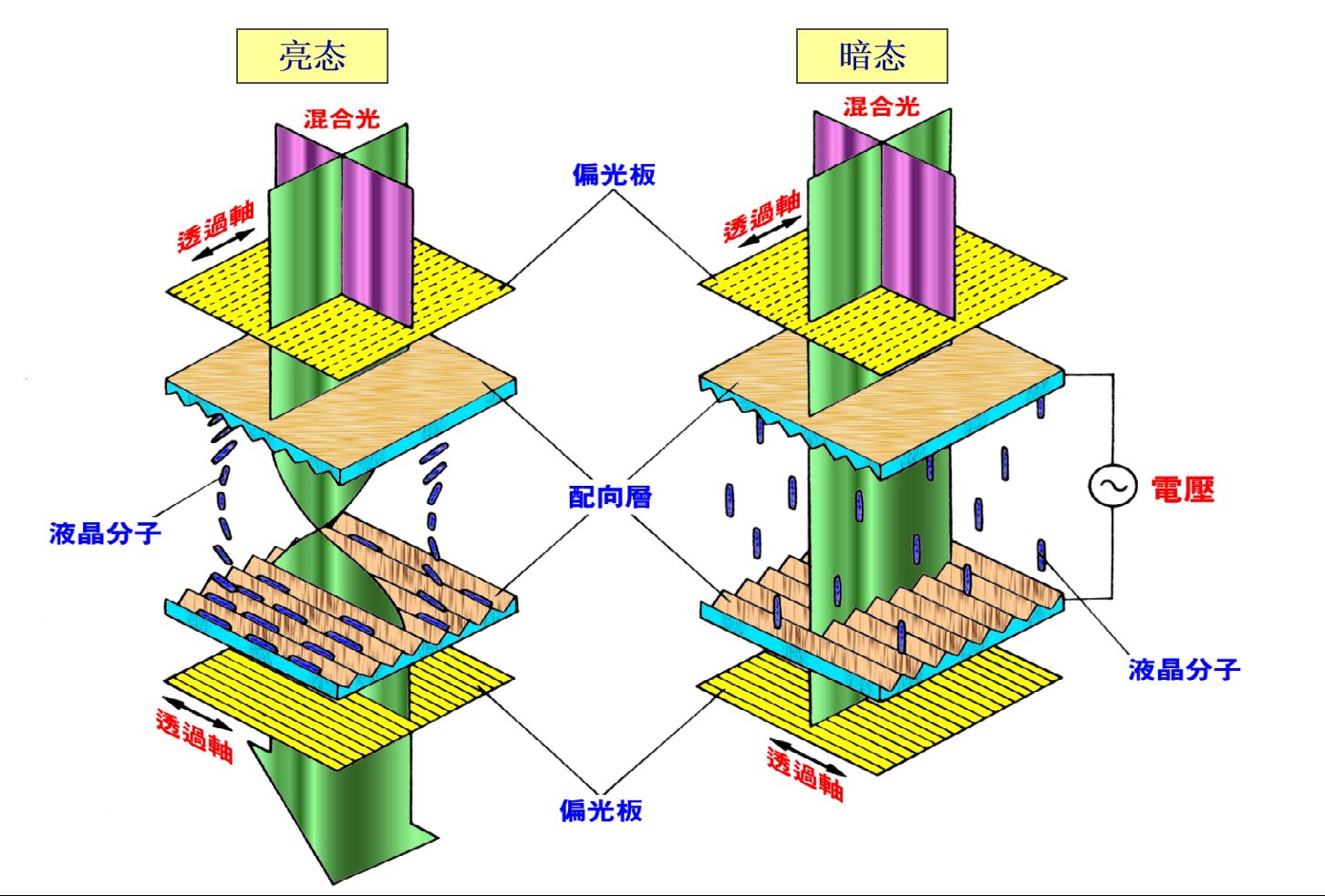 No estado escuro (estado de exibição), as moléculas de cristal líquido em áreas onde um campo elétrico é aplicado mudam seu alinhamento e perdem a capacidade de rotação da luz. A luz polarizada emitida pelo polarizador frontal não pode mudar de direção e é bloqueada porque sua direção de polarização é perpendicular à do polarizador traseiro, fazendo com que essas áreas pareçam pretas.